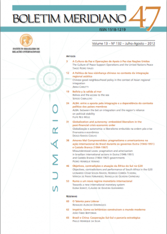 A publicação do Boletim Meridiano 47 é mantida pelo Instituto Brasileiro de Relações Internacionais – IBRI, que conta eventualmente com o apoio de diversas instituições públicas (como o CNPq e a CAPES) e privadas, além da venda de assinaturas e da veiculação do seu conteúdo para as bases de dados privadas mantidas por agregadores internacionais, tais como a EBSCO, Cengage Gale e Proquest.