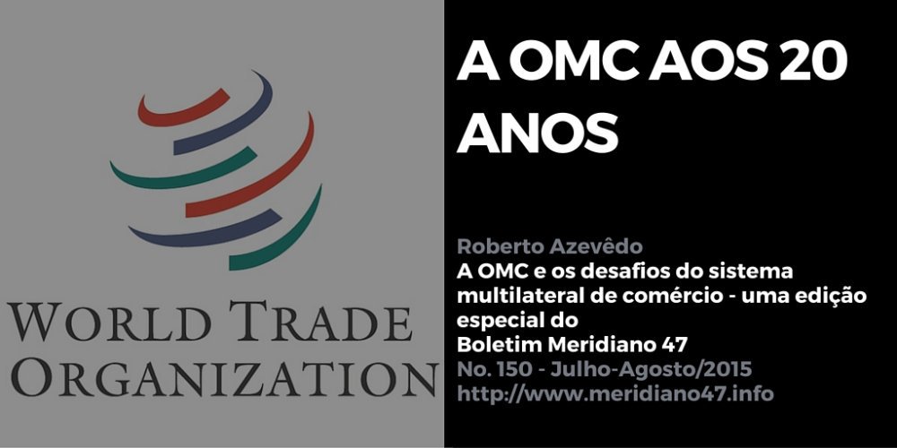 Em 2015, a Organização Mundial do Comércio – OMC comemora vinte anos. Naturalmente, o aniversário da Organização é também um convite a refletir sobre a experiência acumulada nesse período. Em artigo publicado nessa edição especial, o diplomata brasileiro Roberto Azevêdo, que é Diretor-Geral da OMC, passa brevemente em revista em o histórico da Organização, a partir da classificação tradicional das suas funções promover negociações comerciais, solucionar disputas entre seus membros e monitorar a implementação dos acordos existentes e o trabalho relacionado à melhor inserção dos países em desenvolvimento no sistema multilateral de comércio, importante função que a Organização também exerce, sobretudo por meio de assistência técnica.